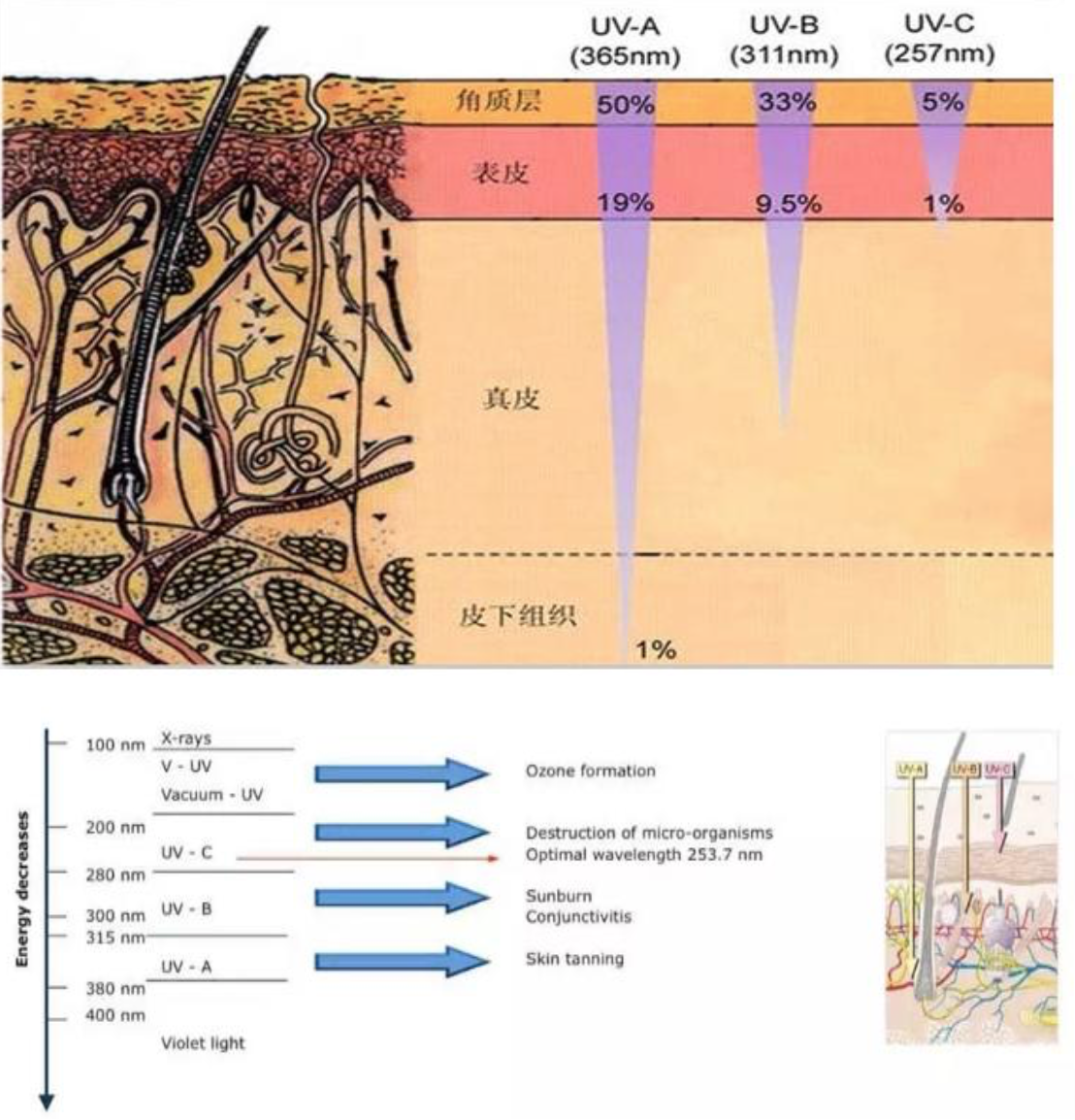 The principle of ultraviolet disinfection and sterilization is to use high energy UVC ultraviolet light to break the double helix Chain of DNA and RNA to kill bacteria and viruses .
